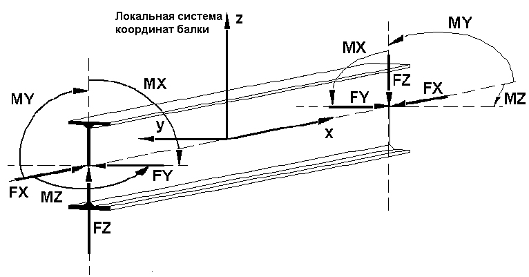 Правило знаков для стержневых элементов основано на правиле, используемом для внутренних усилий в сечениях стержней. В соответствии с этим правилом внутренние усилия имеют такой же знак, если они оказывают на конец стержня такое же действие, как и положительные узловые силы, приложенные к узлу в начале стержня. Такими силами являются силы, направление которых совпадает с направлением осей местной системы координат. Следовательно, сжимающие силы являются положительными, в то время как силы натяжения - отрицательными. Положительные изгибающие моменты MY вызывают натяжение в волокнах стержня, расположенных на отрицательной стороне местной оси координат z. Положительные изгибающие моменты MZ вызывает натяжение в волокнах стержня, расположенных на положительной стороне по местной оси координат y.