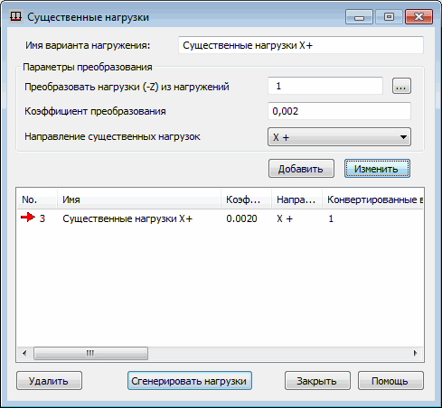 Кнопка Изменить, следующая за кнопкой "Добавить", позволяет менять параметры варианта нагружения, выбранного из списка подлежащих преобразованию.