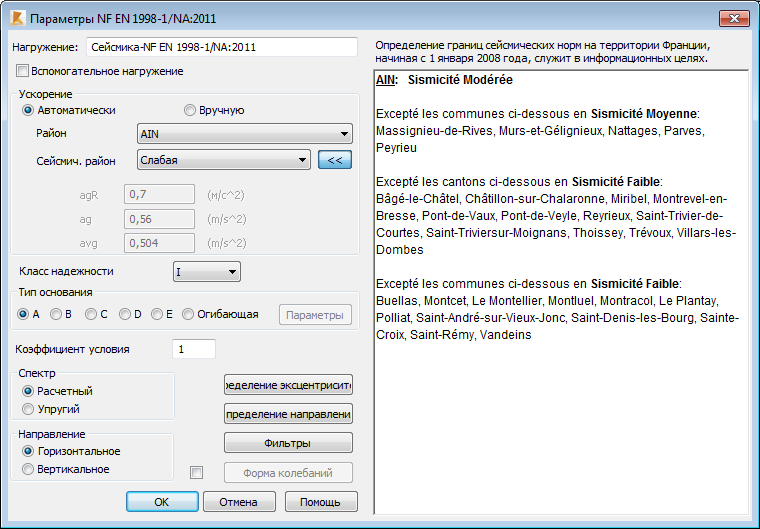 Параметры сейсмического расчета (французские нормы NF EN 1998-1/NA:2010p)