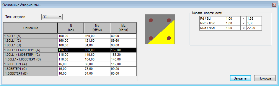 В правой части диалогового окна находится таблица со списком сочетаний нагрузок. Таблица для основных и особых сочетаний представлена отдельно. Каждая строка содержит параметры одного из сочетаний нагрузок, рассмотренных в процессе проектирования колонны. Рядом с компонентами данного сочетания стоит указание на положение поперечного сечения: А - верхнее поперечное сечение, В - нижнее поперечное сечение, С - сечение посередине. Количество строк в таблице соответствует тройному номеру сочетаний нагрузки. В следующих столбцах размещены данные: продольное усилие, изгибающий момент вокруг оси Y, изгибающий момент вокруг оси Z, а также, если учитывалось влияние среза, значения поперечных сил по осям Y и Z.