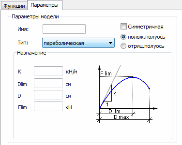 Опции, размещенные на вкладке, позволяют определять нелинейную модель. В верхней части диалогового окна в поле Имя представлены имя активной нелинейной модели и следующие опции: Симметричная, Положительная полуось и Отрицательная полуось. Если выбрано значение Симметрия, параметры: положительная полуось и отрицательная полуось не доступны. Для определения модели требуется положительная ось; тогда как отрицательная ось определяется автоматически на основе определения положительной оси). Если опция Симметрия выключается, тогда опции положительная полуось и отрицательная полуось доступны и определяются раздельно.