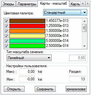 Палитру цветов можно сохранить, открыть из файла или при нормализировать ее. Нормализация шкалы программой состоит в таком изменении шкалы, которое приводит к представлению диаграммы исследуемой величины в масштабе, выбранном в соответствии с максимальным и минимальным значениями этой величины, как пределами ее изменения.