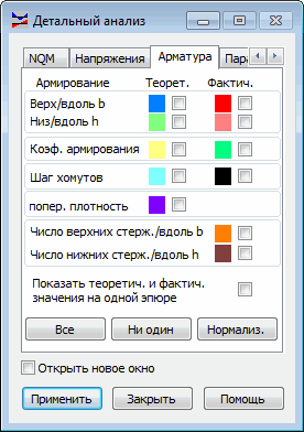 Вкладка "Армирование" диалогового окна "Детальный расчет" позволяет выбрать для представления следующие величины: