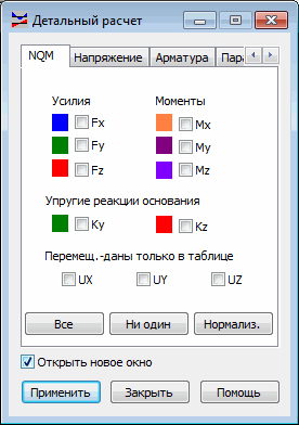 Опция Детальный расчет используется для выбора величин, которые должны быть представлены для стержней, выбранных из конструкции, а также для назначения параметров представления результатов расчета.