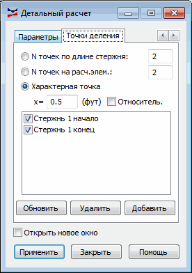 - Если выбрана опция N точек по длине стержня, пользователь может задать в соответствующем поле число точек, включая начало и конец стержня, регулярно распределенных по длине стержня. Число точек по умолчанию N = 2 для этих точек будут представлены полученные в расчете значения выбранных величин. В таблице будут показаны значения величин, выбранные для представления только для начала и конца стержня. Если N = 3, программа добавит точку в середине стержня, разделяя его на две равные части, и представит значение выбранной величины и в этой точке.