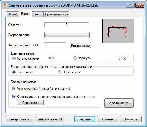 - Автоматически – основное давление ветра автоматически рассчитывается в соответствии с величинами параметров, определяющих расположение конструкции;