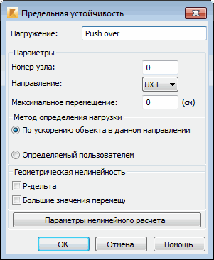 • По ускорению объекта в данном направлении — задание вектора перемещения в ходе расчета предельного равновесия.