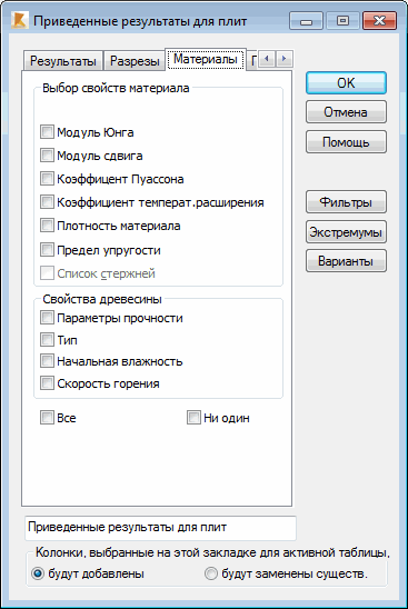 Для выбора свойств материала необходимо выбрать вкладку "Материалы" в диалоговом окне Колоны.