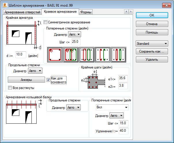 Шаблон армирования: вкладка "Крайняя арматура" (ж/б стена)