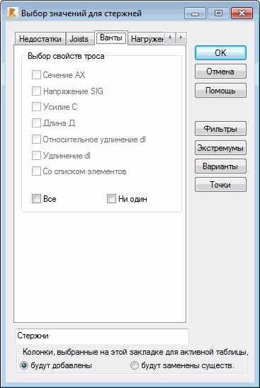 В диалоговом окне Колонки выберите вкладку "Кабели" для того, чтобы выбрать и вывести на экран параметры.