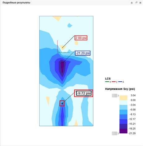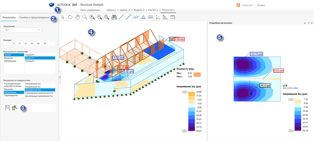 (Просмотр подробных результатов). На этом виде отображаются предельные значения для выбранного типа результата, карты (для элементов поверхности) и схемы (элементов) для элемента, выбранного на 3D-виде (4). Также можно просмотреть значения результатов в выбранных точках.