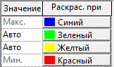 Для определения номера щелкните в поле "Автоматическое значение". Цвет в ячейке "Раскрас. при значении" в той же строке всегда соответствует данному числовому значению независимо от фактических результатов, как показано в следующей таблице.