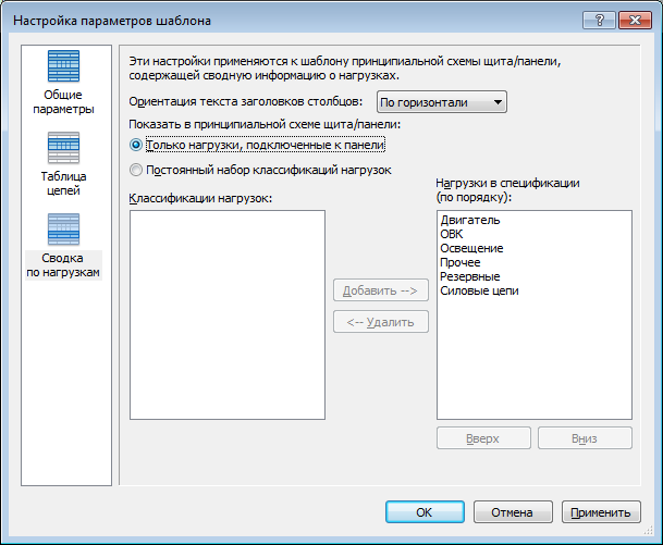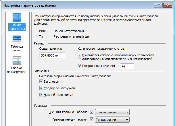 Имеется возможность адаптации внешнего вида спецификаций панели. Можно задать общие параметры внешнего вида, а также параметры для информации о цепях и сводки о нагрузках.
