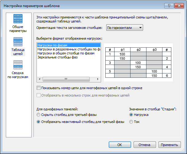 "Нагрузки в разделенных столбцах по фазам". В этом формате показываются 2 цепи в каждой строке. Значения нагрузок выводятся в одном столбце большего размера, разделенном на две части.