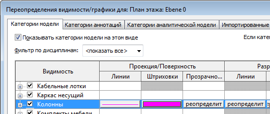 На иллюстрации ниже для категории "Колонны" переопределены линии проекции/поверхности и образцы.