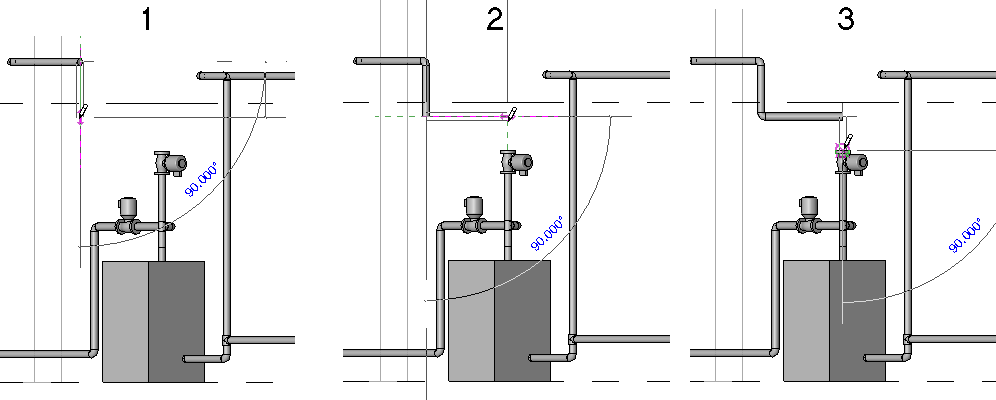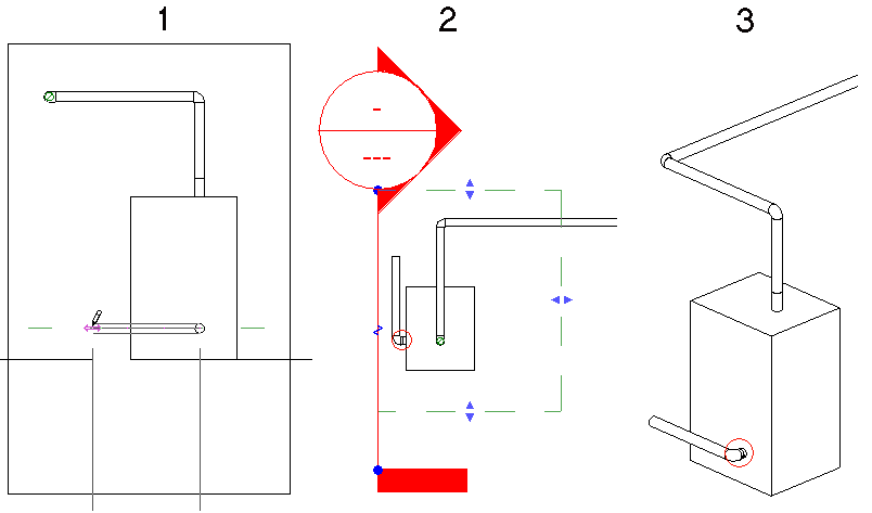 В данном случае, когда труба рисуется на разрезе (1), Revit автоматически добавляет короткий сегмент трубы между соединителем бойлера и отводом, как показано на виде в плане (2) и на 3D виде (3).
