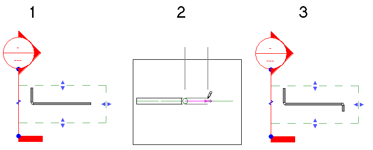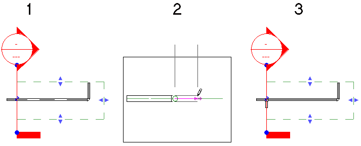 В приведенном ниже примере оба соединителя на существующей трубе (1) являются доступными. Горизонтальный сегмент, добавляемый на разрезе (2), присоединяется к соединителю, ближайшему к плоскости вида, как показано на виде в плане (3).
