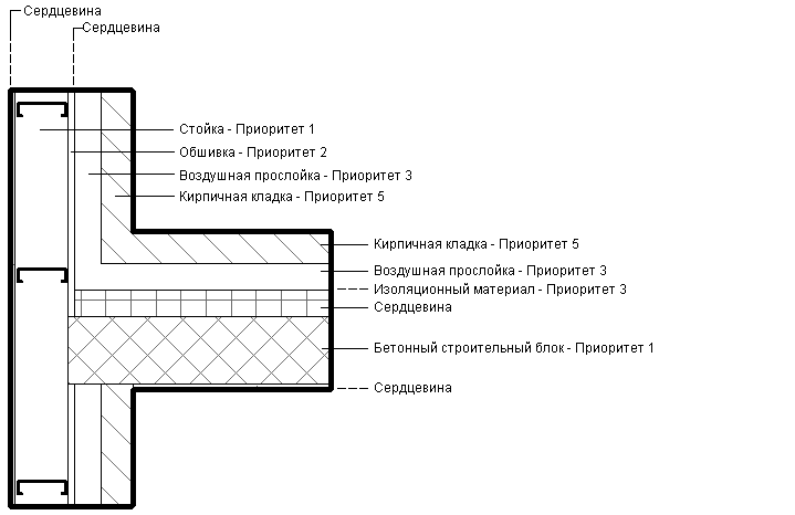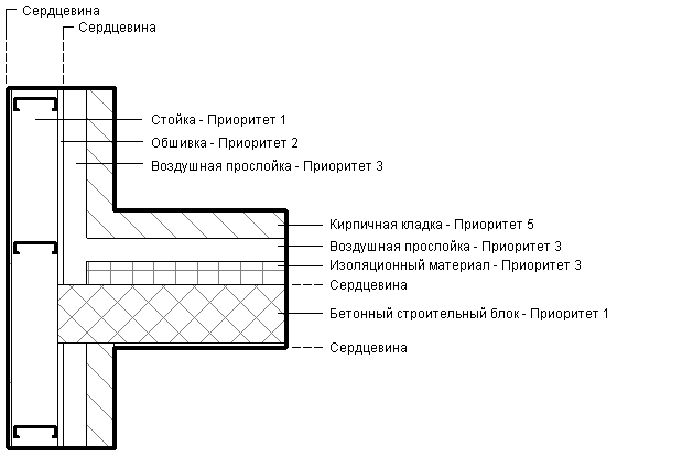 На рисунке показана очередность примыкания слоев в зависимости от их приоритета. Слой горизонтальной стены, имеющий приоритет 1 (кладка из бетонных блоков), пересекает все слои вплоть до слоя каркаса вертикальной стены, также имеющего приоритет 1. Следует отметить, что изоляционный слой горизонтальной стены не пересекает воздушную полость вертикальной стены, поскольку оба они имеют Приоритет 3 и лежат вне слоя сердцевины.