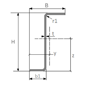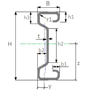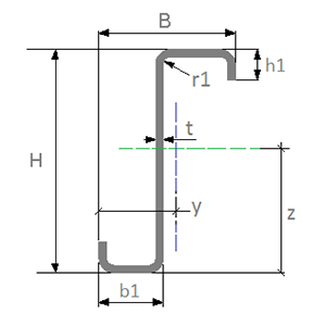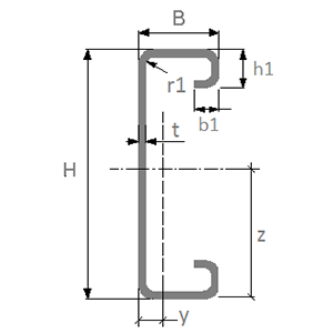 B. Ширина: наружная ширина формы сечения. H. Высота: наружная высота формы сечения. h1. Длина выступа: расстояние между наружными поверхностями формы сечения и концом сегмента выступа. b1. Длина изгиба: расстояние между наружными поверхностями сегмента выступа и концом сегмента изгиба. T. Расчетная толщина стенки: перпендикулярная расчетная толщина между внутренней и наружной поверхностями формы сечения. t. Номинальная толщина стенки: среднее перпендикулярное расстояние между внутренней и наружной поверхностями формы сечения. r1. Внутреннее сопряжение: радиус сопряжения внутреннего угла формы сечения изгиба в форме сечения стальной балки, изготовленной холодным формованием. y. Горизонтальный центроид: расстояние от центроида формы сечения до левого края по горизонтальной оси. z. Вертикальный центроид: расстояние от центроида формы сечения до нижнего края по вертикальной оси. |