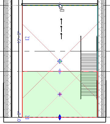 Если пространство выходит по вертикали за пределы элемента с функцией границы помещения, например пола или потолка, выполняется привязка пространства к элементу с функцией границы помещения. Однако элементы управления, предназначенные для перетаскивания, и интерактивные размеры указывают заданную протяженность по вертикали, как показано на следующем рисунке.