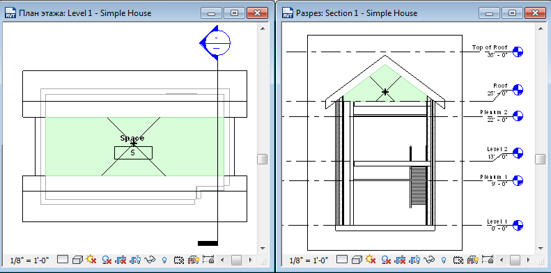 - Закройте все виды, кроме разреза и плана этажа, на котором требуется разместить пространство, и введите с клавиатуры WT для расположения этих двух видов без перекрывания.