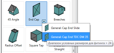 При нажатии на стрелку появится раскрывающийся список, содержащий дополнительные детали соответствующего размера. Этот раскрывающийся список регулируется условиями определения службы, аналогично настройкам трассировки. Например, изгиб может представлять собой как штампованный отвод для достижения определенного размера, так и сегментный отвод, выходящий за пределы данного размера. При наведении курсора на элемент в списке во всплывающей подсказке отображается диапазон размеров на основе условия для данной детали.