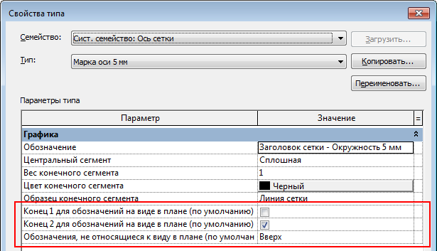 - Установите флажок "Конец 1 для обозначений на виде в плане (по умолчанию)", если марка должна отображаться в начале оси на плане.