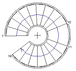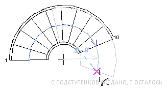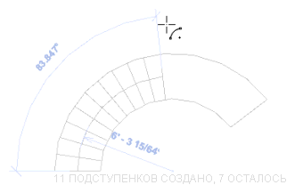 - Создайте винтовой марш по центру и конечным точкам указанным выше способом. При этом задайте конечную точку для площадки, на которой будет достигнуто требуемое количество подступенков (меньшее, чем общее количество).