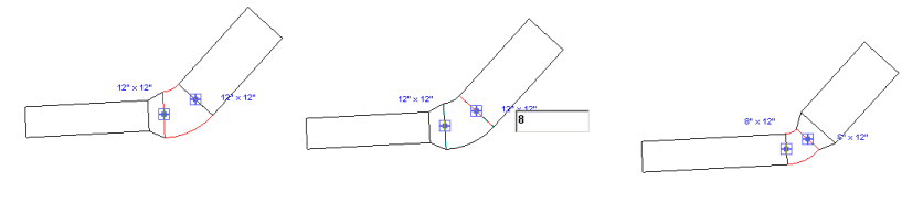 Для прямоугольных и овальных воздуховодов значения в полях ширины и высоты необходимо вводить по отдельности. На следующей иллюстрации размер отвода прямоугольного сечения меняется с 12" x 12" на 8" x 12".