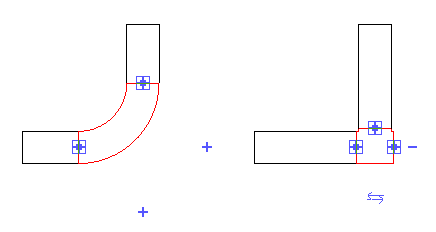 Рядом с фитингом появляются элементы управления синего цвета. Когда все имеющиеся на фитинге соединители заняты, другие потенциальные отводы помечаются знаком "плюс". Рядом с неиспользуемыми отводами присутствует знак "минус", который позволяет удалить лишние отводы, тем самым заменив фитинг более простым фитингом.