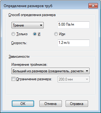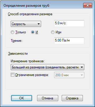 В диалоговом окне "Определение размеров труб" можно задать применение только одного из способов (выберите "Только") или сочетания обоих способов (выберите "И" или "Или").