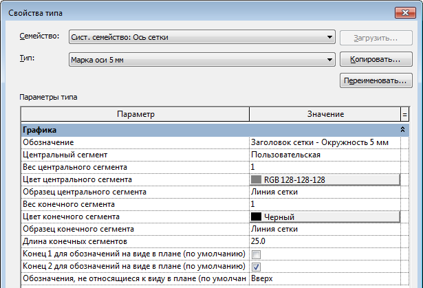 Такая настройка выполняется путем изменения типа сетки. Изменения применяются ко всем координационным осям, использованным в видах.