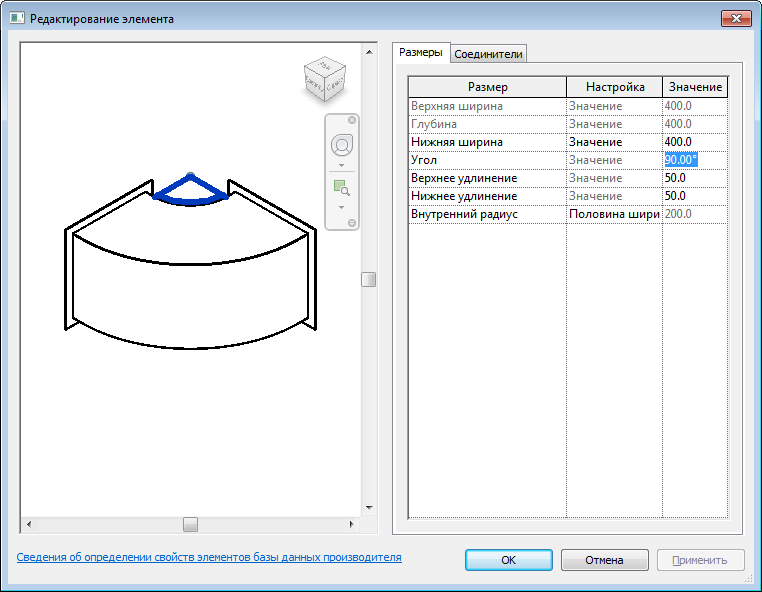 Элемент базы данных производителя можно редактировать в Revit, чтобы определить необходимые размерные значения и параметры.