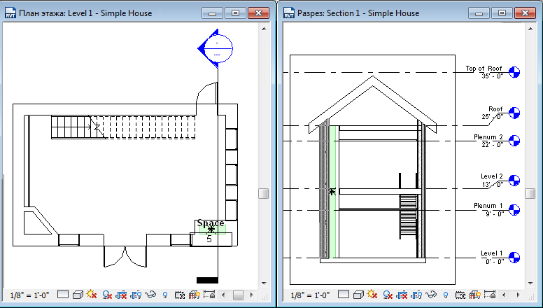 - Закройте все виды, кроме разреза и плана этажа, на котором требуется разместить пространство, и введите с клавиатуры WT для расположения этих двух видов без перекрывания.