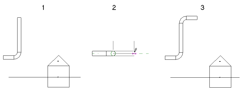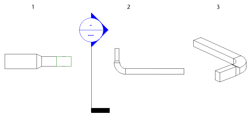 В приведенном ниже примере оба соединителя на существующем воздуховоде (1) являются доступными. Горизонтальный сегмент, добавляемый на разрезе (2), присоединяется к соединителю, ближайшему к плоскости вида, как показано на виде в плане (3).