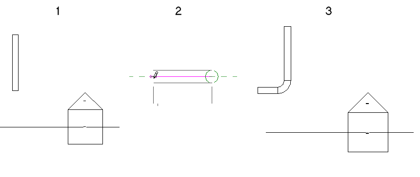 При отсутствии в секущем диапазоне доступных соединителей, как на виде в плане (1), новый воздуховод (добавленный на фасаде (2)) присоединяется с помощью тройника на пересечении плоскости фасада и существующего воздуховода (3). Осевая линия воздуховода размещается непосредственно на плоскости вида.