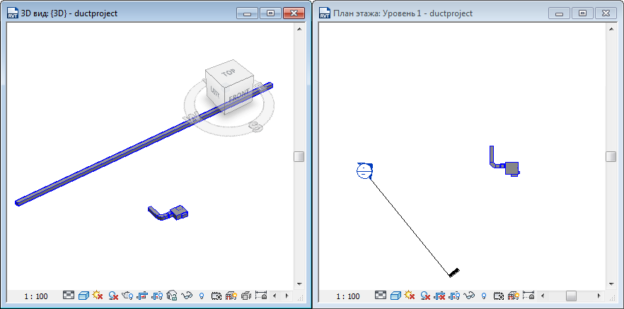 На связанном 3D виде показано собственно создание воздуховода. Получившийся воздуховод нарисован в виде вертикального сегмента и горизонтального сегмента для соединения с воздуховодом на уровне 2. Горизонтальный сегмент проходит перпендикулярно плоскости разреза.