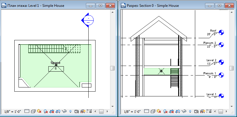 - Закройте все виды, кроме вида разреза и плана этажа для уровня служебного пространства, и введите с клавиатуры WT для расположения этих двух видов без перекрывания.