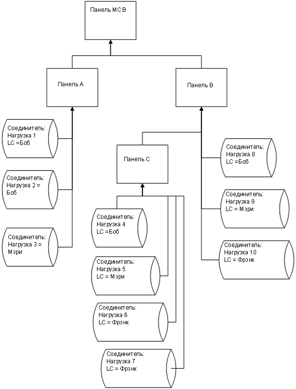Полная подключенная нагрузка для панели рассчитывается путем суммирования нагрузок, относящихся к тому же классу и подключенных непосредственно к данной панели, к ее дочерним панелям и к панелям, дочерним по отношению к дочерним панелям.