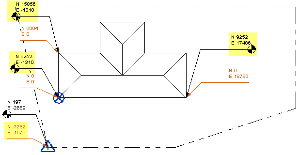 При создании новой модели по умолчанию базовая точка проекта и точка съемки размещаются на внутреннем начале, также называемом исходным местоположением. Для определения системы координат проекта необходимо переместить базовую точку проекта из внутреннего начала в другое местоположение, например, в угол здания.