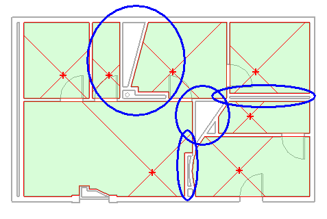 Объем пространства, расположенный в окруженной зоне, рассчитывается до поверхностей компонентов с функцией границ помещений, таких как стены, полы, потолки, крыши и линии-разделители помещений. Объем пространства продолжается по горизонтали и по вертикали до граней компонентов с функцией границ комнат. Поверхности относятся к одной из двух категорий.