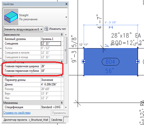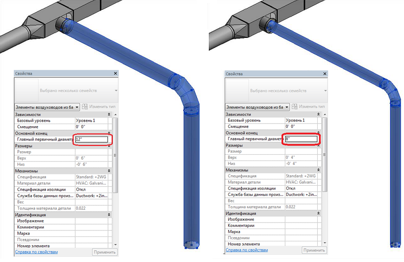 На примере ниже показан участок воздуховодов круглого сечения. На палитре свойств значение поля «Главный первичный диаметр» изменено с 12" на 8".
