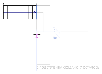 - Переместите курсор вдоль выносной линии и щелкните мышью, чтобы начать рисование остальных подступенков для второго марша. Следует учитывать, что площадка создается автоматически. (По умолчанию ширина площадки равна ширине марша).