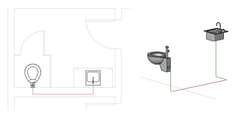 Оба сантехнических прибора должны быть назначены системе "Канализация" но, поскольку скорость потока в системе канализации зависит от земного притяжения, трубопровод должен иметь уклон.