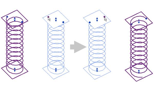 Размещенный спиральный арматурный стержень можно поворачивать, чтобы добиться выравнивания его конца в соответствии с требованиями. Чтобы повернуть конец размещенного арматурного стержня, перетащите ручку поворота в конце верхнего витка арматурного стержня.