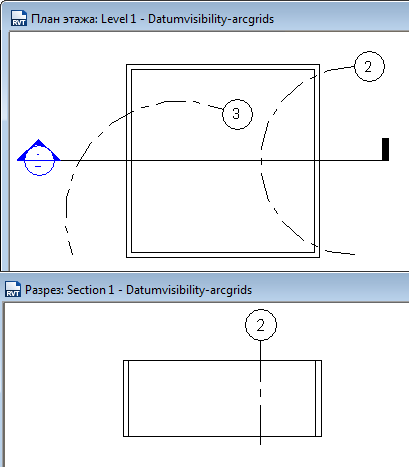 Например, на следующем плане этажа построены 2 дуговые координационные оси. Линия сетки 3 пересекает линию разреза, но касательная к ней, проходящая через центральную точку, не перпендикулярна линии разреза. Как следствие, линия сетки 3 не отображается на разрезе. Линия сетки 2 пересекает линию разреза на плане этажа, а касательная, проходящая через центральную точку, перпендикулярна к линии разреза. Поэтому линия сетки 2 отображается на разрезе, указывая центр дуги.