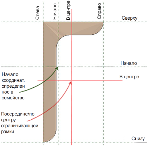 На следующем рисунке показано различие между началом координат геометрии семейства и центром ограничивающей рамки.