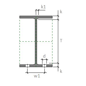 w1/2. Интервал между болтами - полка: расстояние от центра ребра жесткости до одиночного отверстия болта полки несущего тавра. При наличии двух отверстий болтов полки это расстояние равно половине интервала между болтами. w2.Интервал между болтами - ребро жесткости: расстояние от внешнего края полки до одиночного отверстия болта полки несущего тавра. d. Диаметр болта: максимальный диаметр отверстия болта. |