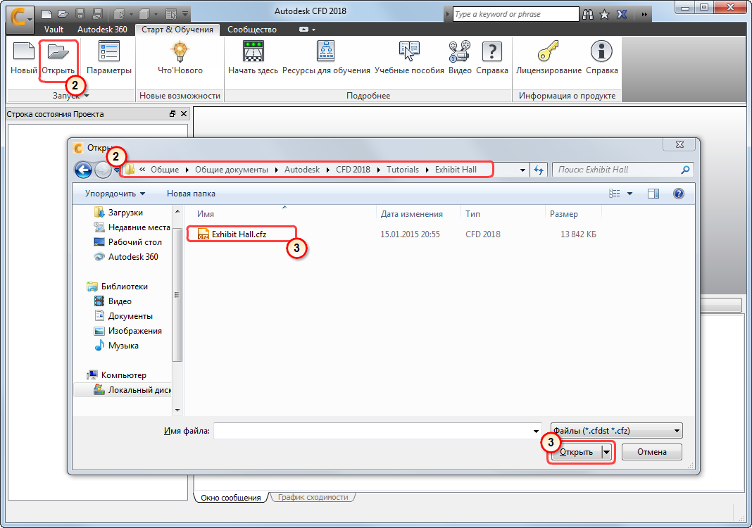 2. На панели Запуск нажмите Открыть и перейдите к папке C:\Users\Public\Public Documents\Autodesk\CFD 2018\Tutorials\Exhibit Hall.