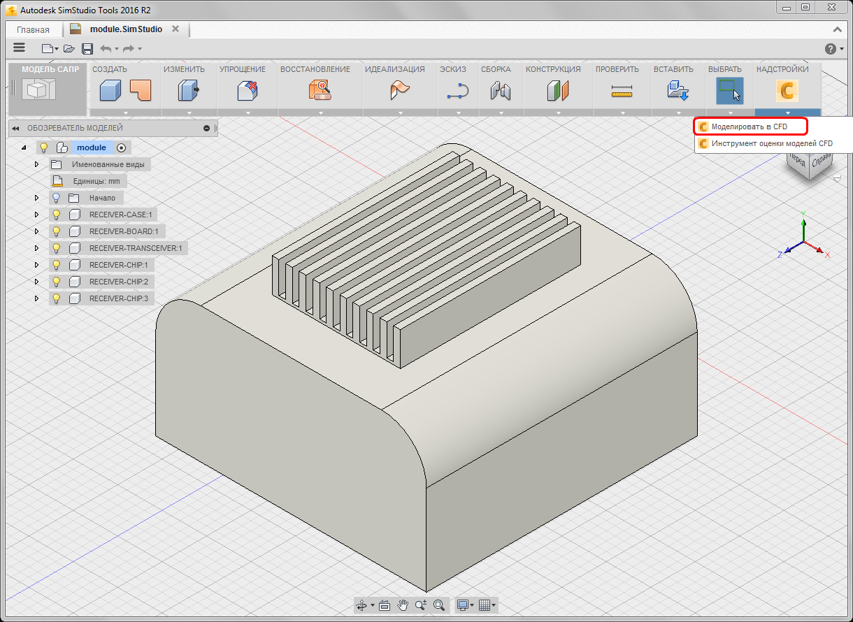 Разверните меню Надстройки и выберите Моделировать в CFD.